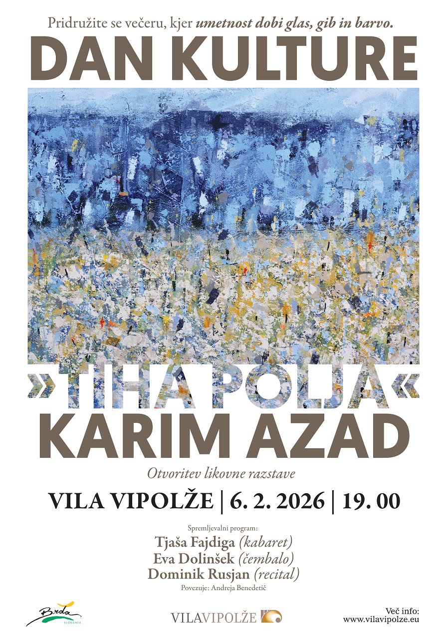 RezervirajV petek, 6. februarja 2026 ob 19.00, vas vabimo v našo renesančno vilo na poseben večer, posvečen slovenski umetnosti, glasbi in kulturi. Dogodek bo ponudil raznolik program, ki združuje vizualno umetnost, glasbo, literaturo in kabaretno izražanje v prefinjenem kulturnem večeru. Na ...